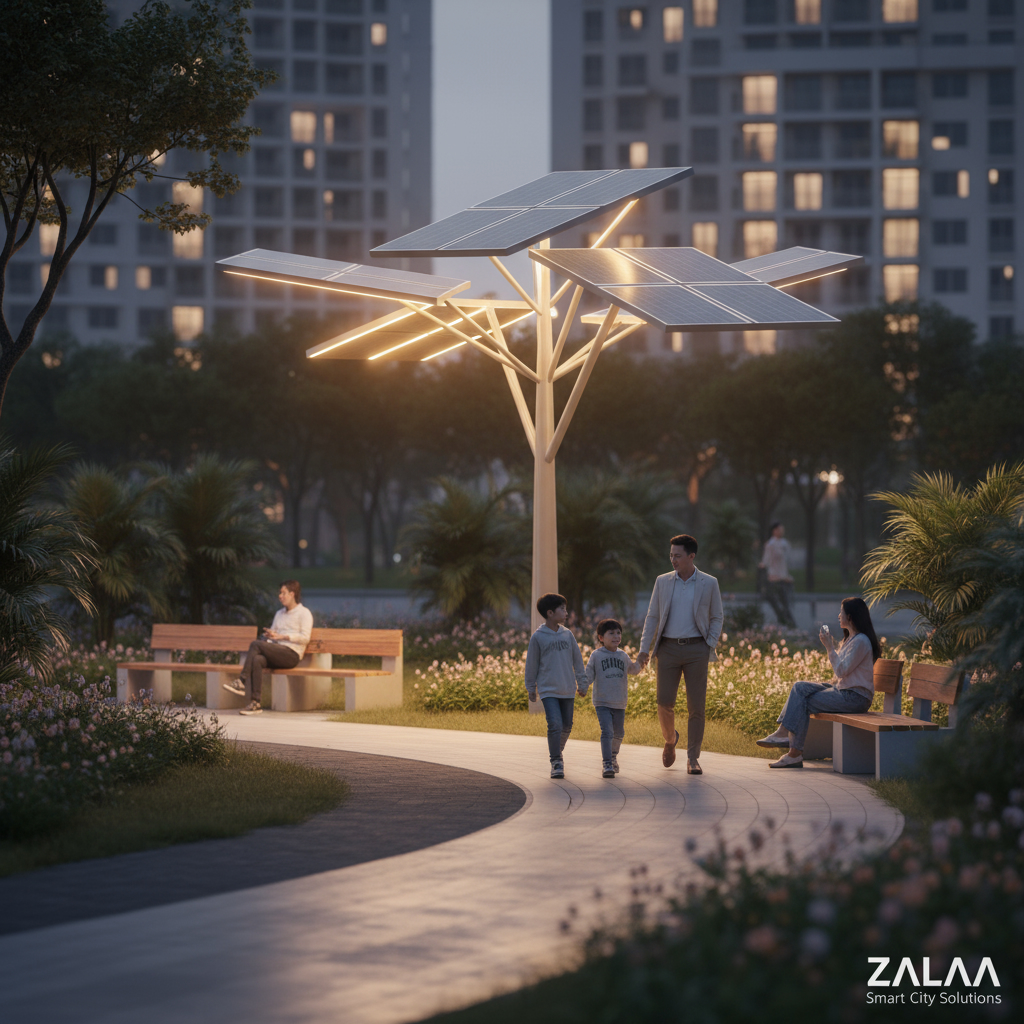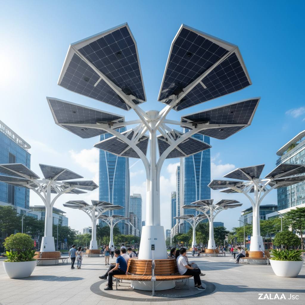 ✅ ZALAA Lighting xin thưa, Cây Năng Lượng Mặt Trời là một cấu trúc độc đáo mô phỏng hình dáng một cái cây, với các "tán lá" là những tấm pin năng lượng mặt trời hiệu suất cao. Nó hấp thụ quang năng vào ban ngày để chuyển hóa thành điện năng, cung cấp ánh sáng vào ban đêm và cấp nguồn cho các tiện ích công cộng như trạm sạc điện thoại, wifi, camera an ninh. Đây chính là sự giao thoa tuyệt vời giữa công nghệ, nghệ thuật và thiên nhiên, góp phần xây dựng không gian sống bền vững, thông minh và đầy tính thẩm mỹ.