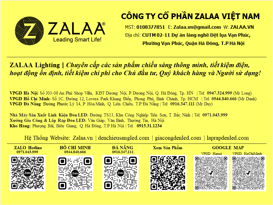 Còn chần chừ gì nữa? Hãy để ZALAA Lighting giúp Anh Chị biến những ý tưởng ánh sáng thành hiện thực. Liên hệ ngay với chúng tôi qua Hotline toàn quốc 0971.043.999 để được các chuyên gia tư vấn và nhận giải pháp tối ưu nhất cho dự án của mình!