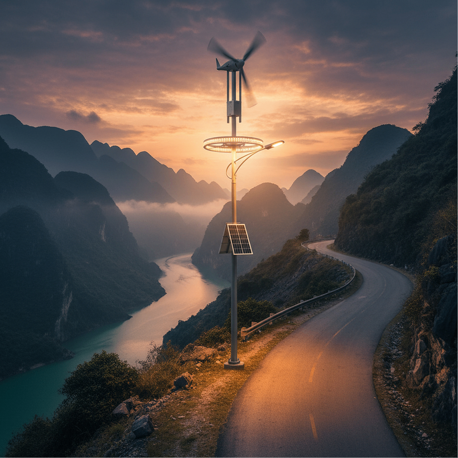 Đây là một hệ thống chiếu sáng thông minh, tự chủ hoàn toàn và không phụ thuộc vào lưới điện quốc gia. Giải pháp này khai thác đồng thời hai nguồn năng lượng sạch và vô tận: năng lượng mặt trời vào ban ngày và năng lượng gió cả ngày lẫn đêm. Năng lượng được lưu trữ trong hệ thống pin LifePO4 dung lượng lớn để cung cấp cho đèn LED chiếu sáng ổn định, kể cả trong những ngày mưa bão hoặc không có nắng. Hệ thống đặc biệt phù hợp với các địa hình đa dạng của Việt Nam, từ vùng núi cao, đường đèo đến các tuyến đường ven biển và hải đảo xa xôi