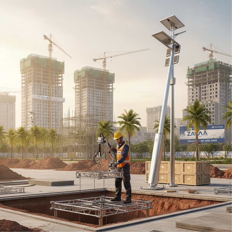 ZALAA Lighting hiểu rằng, một cây cột đèn dù hiện đại đến đâu cũng không thể bền vững nếu thiếu đi một nền móng kiên cố. Đó là lý do chúng tôi không chỉ bán sản phẩm, mà mang đến một giải pháp tổng thể về Kết Cấu Móng & Lắp Đặt. Giải pháp này được xây dựng từ kinh nghiệm thực chiến tại hàng ngàn công trình, bao gồm từ khâu tư vấn lựa chọn vật tư phù hợp với địa chất, đến cung cấp sản phẩm đồng bộ và hướng dẫn thi công chuyên nghiệp, đảm bảo mỗi cây cột được dựng lên đều là một biểu tượng của sự an toàn và bền vững.
