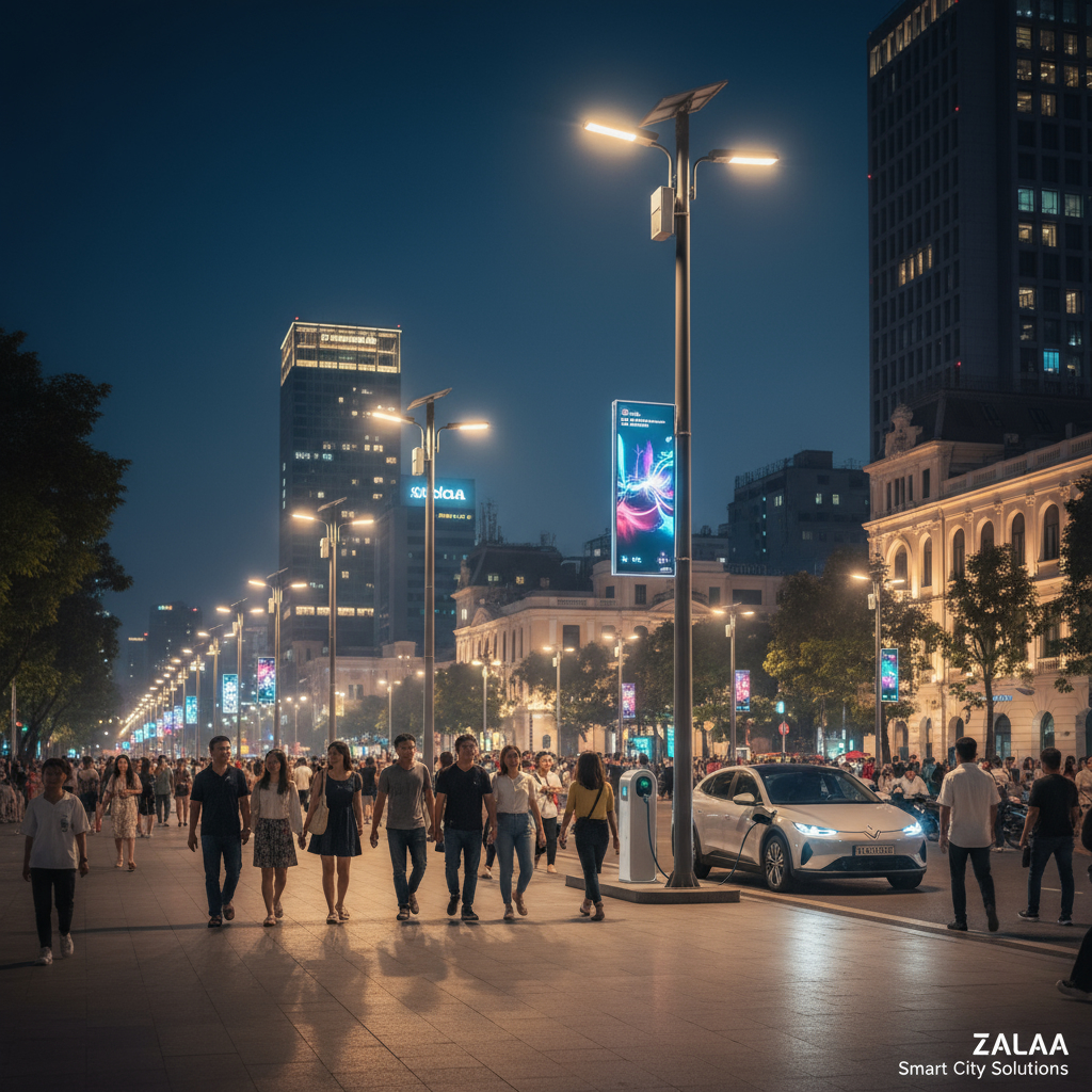 Trong giai đoạn 2025-2030, kiến trúc thượng tầng sẽ không chỉ dừng lại ở chiếu sáng. Xu hướng tất yếu là tích hợp Trí tuệ nhân tạo (AI) để hệ thống có thể tự học và dự đoán, tối ưu hóa sâu hơn nữa. Dữ liệu từ hệ thống chiếu sáng sẽ được kết hợp với dữ liệu giao thông, thời tiết để tạo ra các mô hình quản lý đô thị năng động. Mỗi cột đèn ZALAA sẽ trở thành một nút mạng (node) quan trọng trong mạng lưới IoT khổng lồ của thành phố, phục vụ cho vô số ứng dụng từ an ninh, môi trường đến giao thông tự hành.
